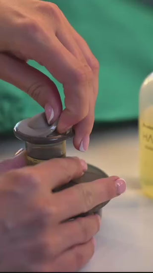 - Remove the cap and fill the top chamber with your favourite hair or scalp oil